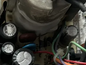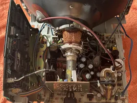 Hat jetzt nichts mit Deinem Problem zu tun, aber: Ich würde mir mal den braunen Kleber auf dem Zeilentrafo genau anschauen. Der scheint mir die Metallklammer unten drunter zu korrodieren. Wenn das so ist, dann muß das Zeugs möglichst schnell weg.