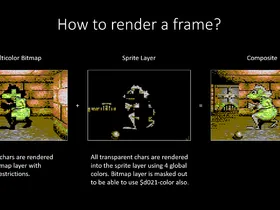Hier mal mit Transparenzen. Es schaut so aus, dass die Grafiken zwar regulär als Multicolor-Bitmap angelegt sind. Allerdings kann nach Belieben auch Transparenz verwendet werden. Der jeweilige 4x8-Pixel-Block switcht dann auf den Sprite-Layer und ist auf die Sprite-Farben beschränkt. -