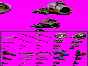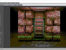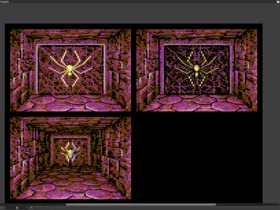 Das ist an sich Multicolor-Bitmap. Allerdings kann ich in einzelnen 4x8-Pixel-Blöcken auch auf den Sprite-Layer wechseln. Das funktioniert aber nur vernünftig, wenn dahinter bereits Grafikelemente liegen (also wie bei Wand-Deko oder Monsterkonturen).