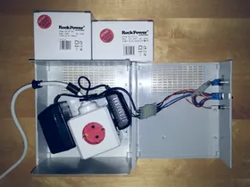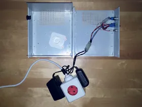 Die Netzteile hab ich einen Würfel-Stecker gepackt der eine praktische Halterung hat: Die passt in eine Steckdose des Würfels und wird dann "verdreht". Damit hat der Würfel dann im Gehäuse halt und er lässt sich immer wieder herausnehmen. Der Würfel steckt mit Absicht "schräg" im Gehäuse, so können die beiden Steckernetzteile nicht von alleine aus der Steckdose rutschen.